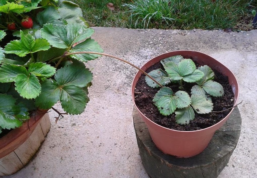 Pues como ya he dicho tenía un macetero con varias plantas de fresas y primero pensé en sacar esquejes para plantarlas en otras macetas. Como veréis en la foto no es necesario hacerlo así, porque aunque cortes directamente y plantes seguro que arraigan, pero como no tenía mucha prisa las deje con el tallo y cuando vi que habían agarrado las corte.