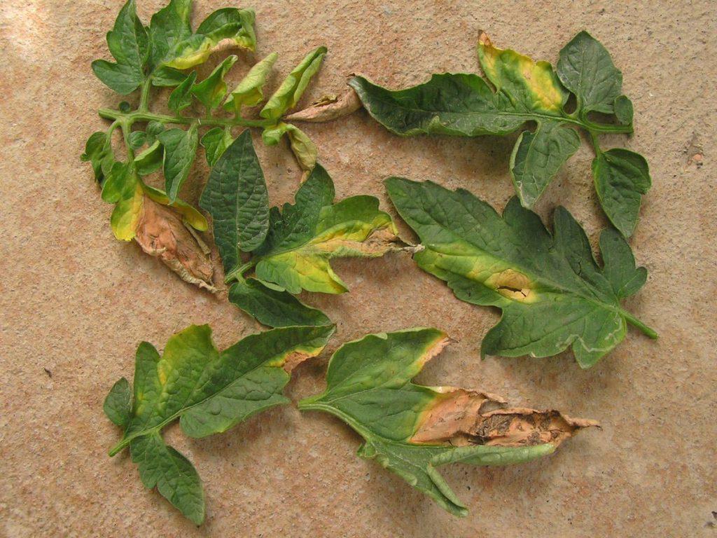 Hojas de tomatera afectadas por Mildiu