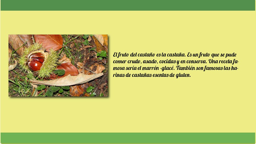 Su fruto es la castaña. Es un tipo de fruto seco. Su consumo tiene innumerables beneficios; ya que tienen pocas grasas y gran cantidad de hidratos de carbono. Ademas de innumerables efectos beneficiosos para la salud: vitaminas del grupo B, ricas en potasio, y hierro.