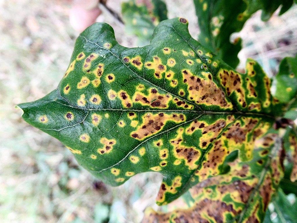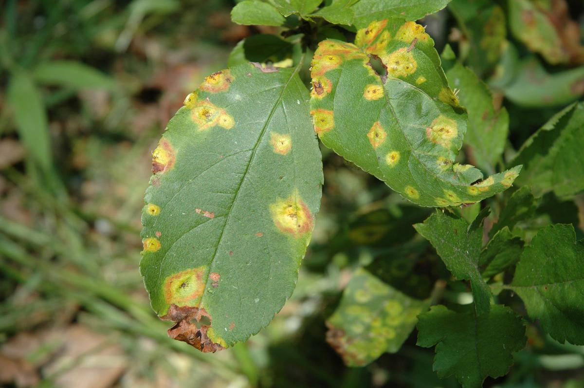 Las hojas infectadas desarrollan manchas, luego se vuelven amarillas o marrones y se caen del árbol.