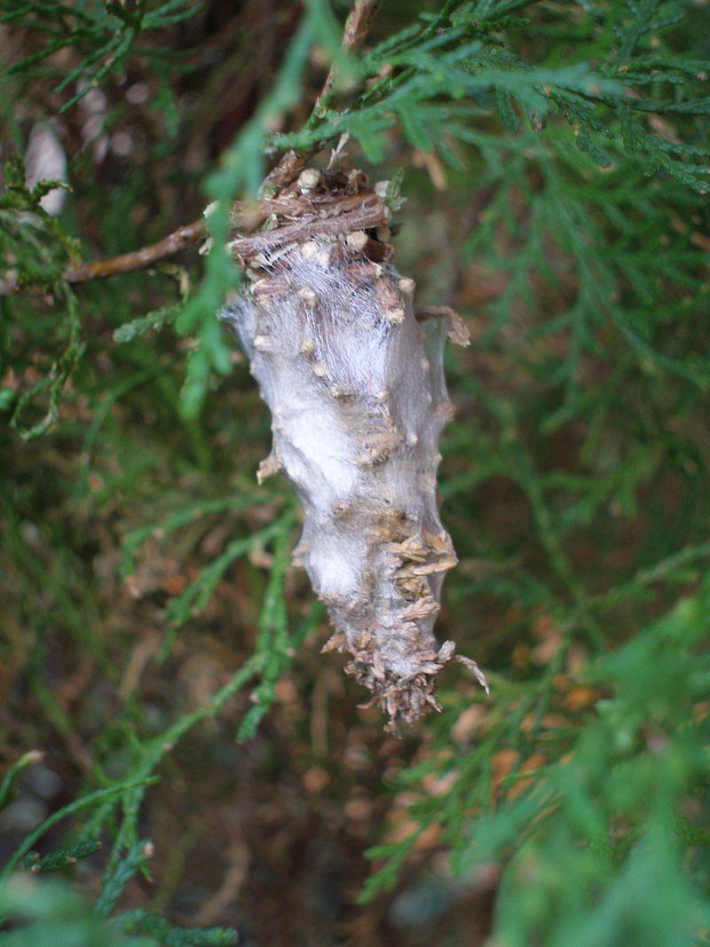 Rocía con Bacillus thuringiensis (Bt) a finales de primavera para matar gusanos jóvenes. recoje y destruye los canastos en invierno para reducir la cantidad de huevos y crías al año siguiente.