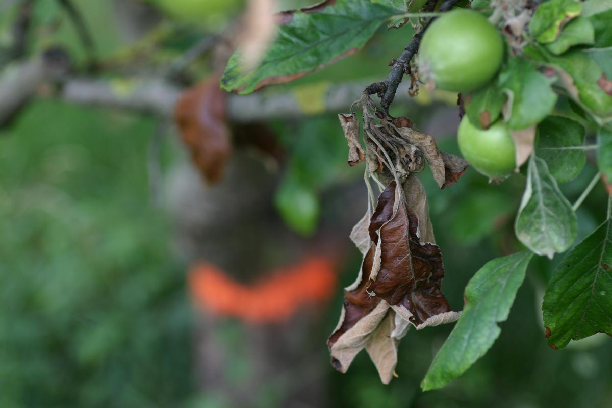 Se pueden ver las puntas de las ramas infectadas colgando hacia abajo. La corteza en la base de la ramita marchita adquiere una apariencia acuosa húmeda, luego se ve oscura, hundida y seca. El tizón de fuego del peral y del manzano ataca unas cuantas ramitas a la vez para crear un efecto de follaje muerto en diferentes áreas de la planta.