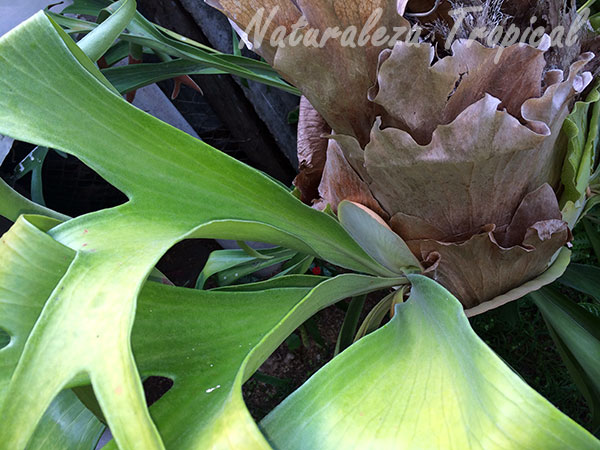 Vista de las hojas aéreas y de base de un Platycerium