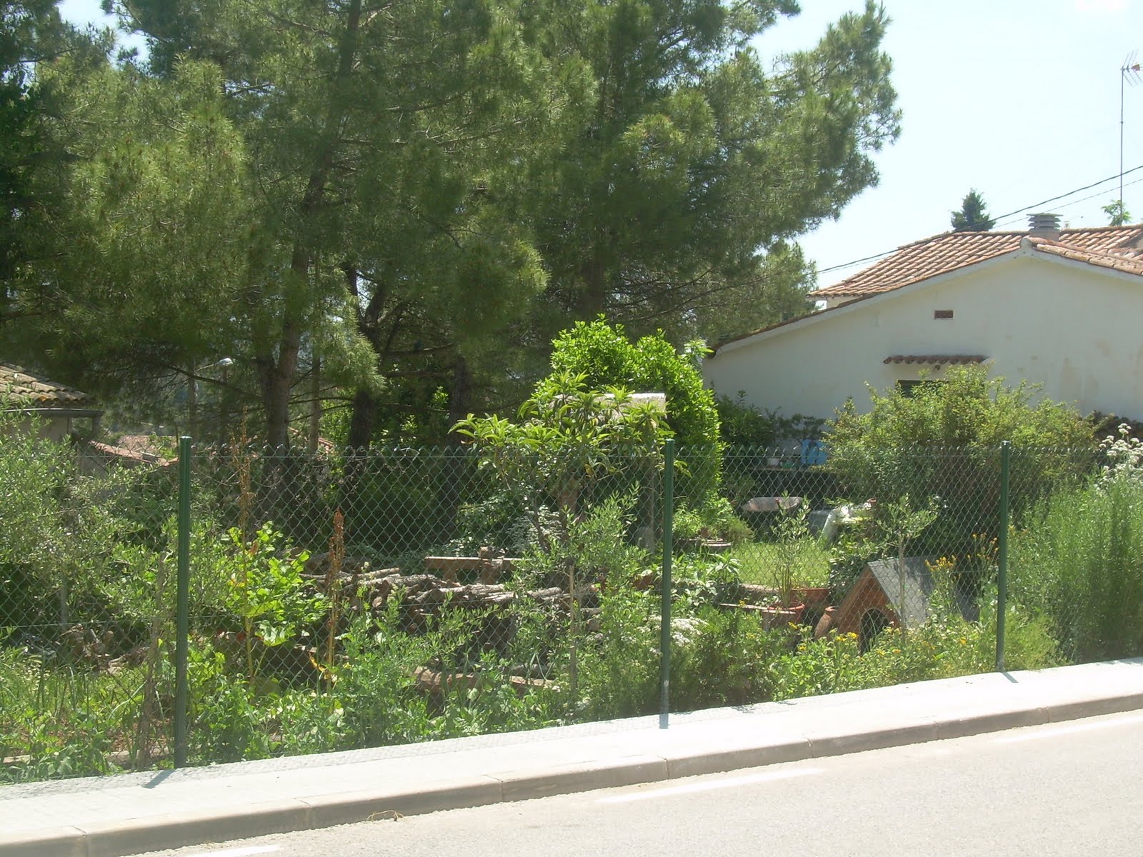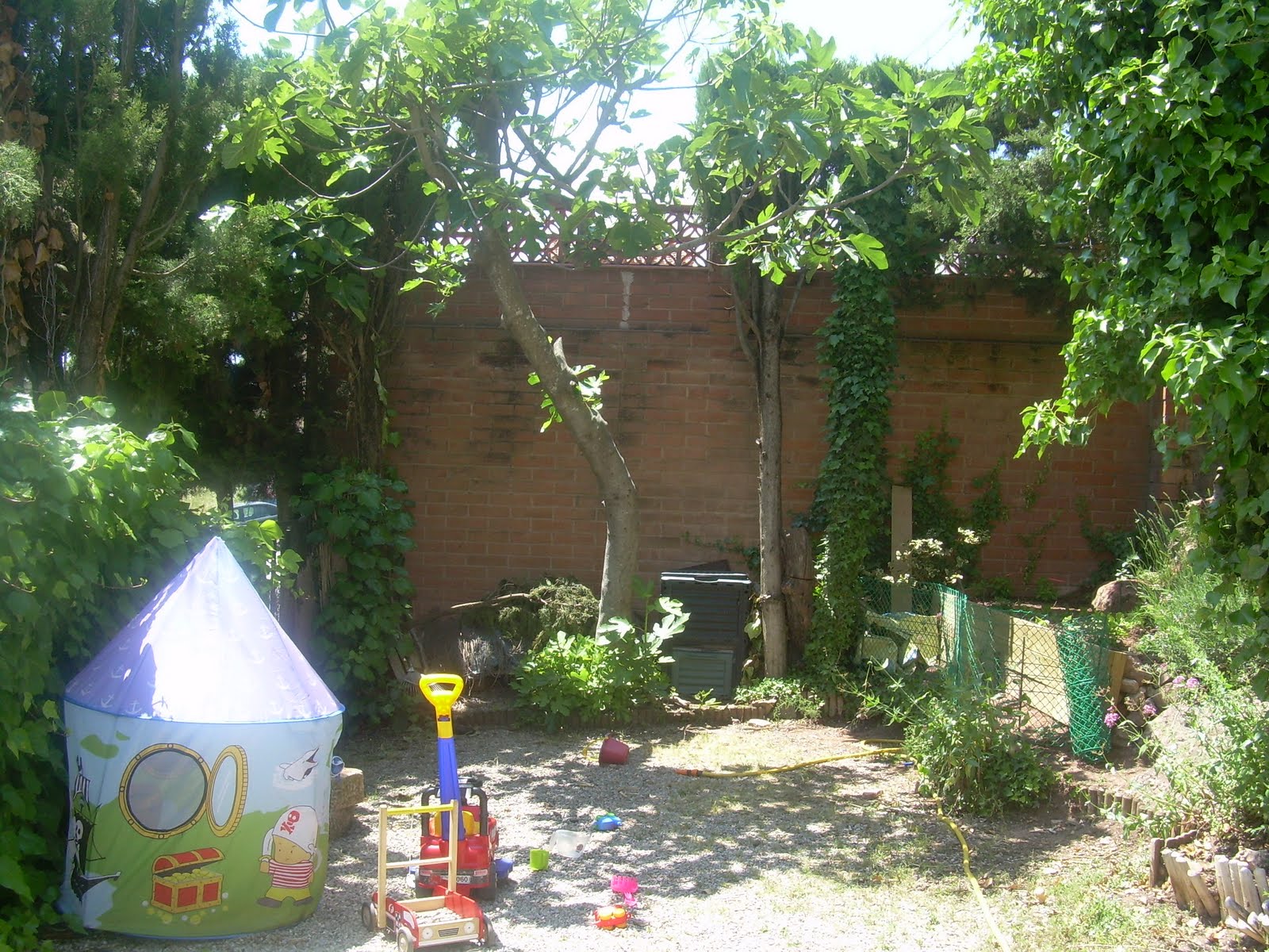 Y bueno, así es un trocito de nuestro patio cada día, con nuestro pequeño hu erto a un lado y la super caseta de piratas de Ahmed Nur con todos los juguetes tirados, por otro.