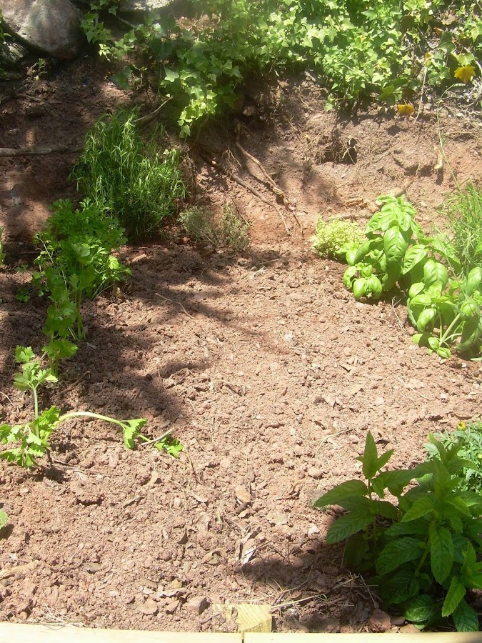 Hay un huequito vacio para plantar las zanahorias. Al lado están las albahacas y el tomillo limonero. Es la foto de la izquierda y en la de al lado se ve el fiel espacio que espera las zanahorias.