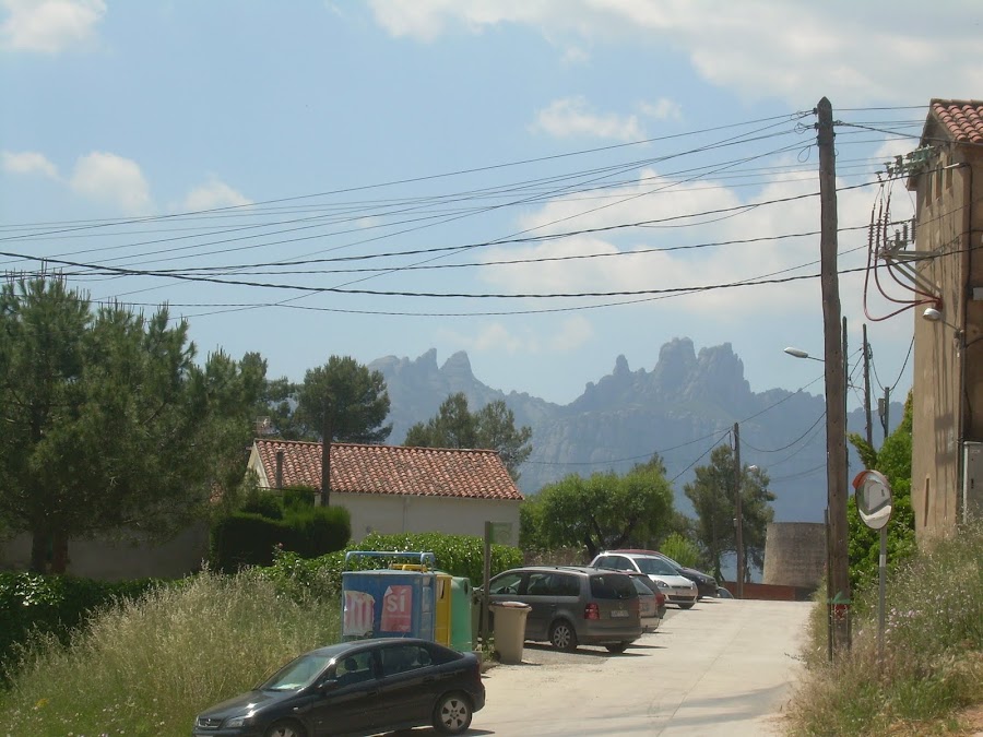 el pueblito, la casita y huerto de los vecinos y, a la derecha, bien presente siempre con su peso, su magia, su belleza y su baraka, Montserrat.