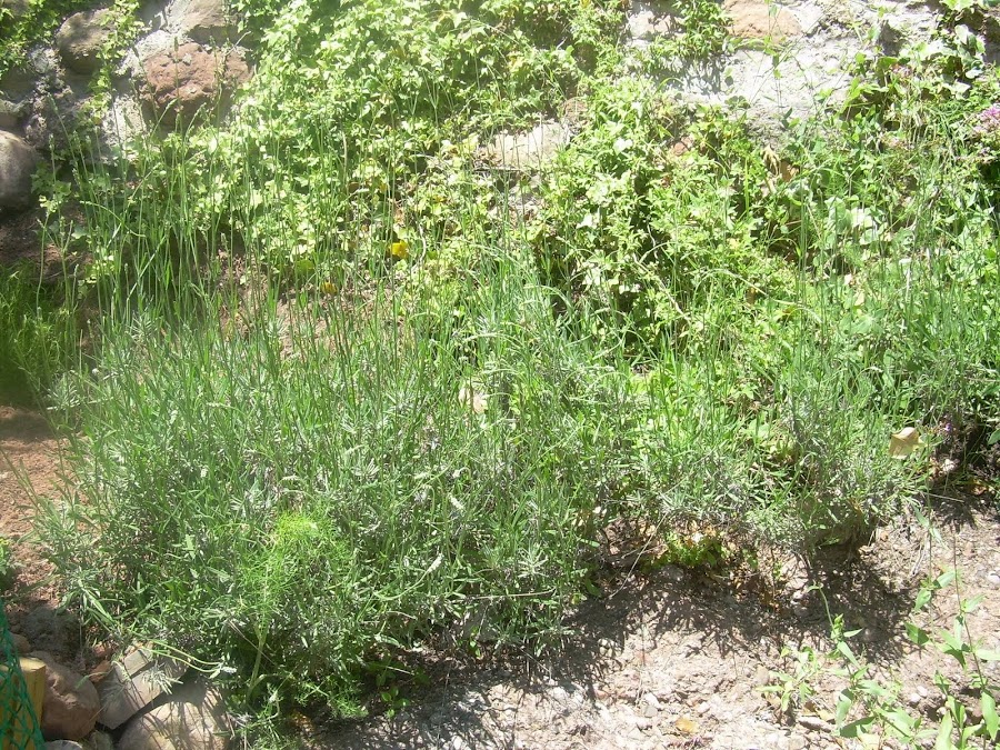 A la derecha, la lavanda. Ya estaba plantada aquí cuando vinimos y pronto saldrá.