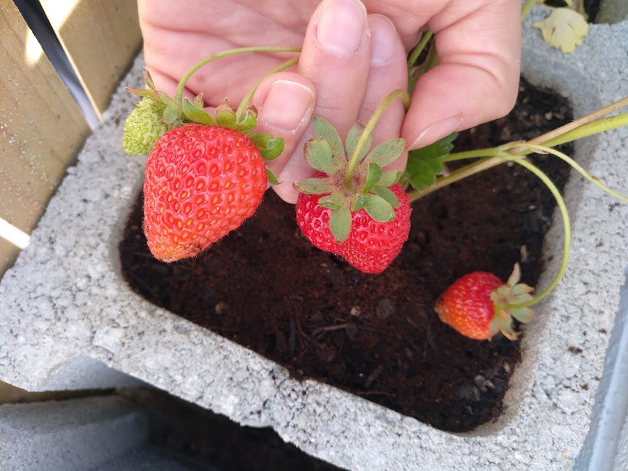 ¡Mirad qué fresas! Días atrás estaban enanas y verdes...y además riquísimas :).