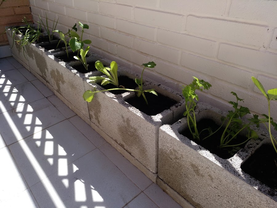 Compré varios bloques y placas de cemento y dado que el cemento tiene la capacidad de absorber el agua, lo único que hice fue colocar el bloque sobre la placa y empezar a cultivar.