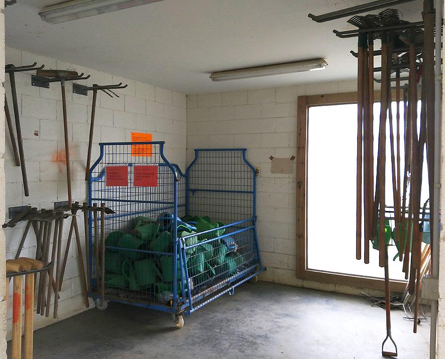 También cuenta con un almacén para guardar herramientas, taquillas, vestuarios, sanitarios, un aula-taller y una oficina de información.