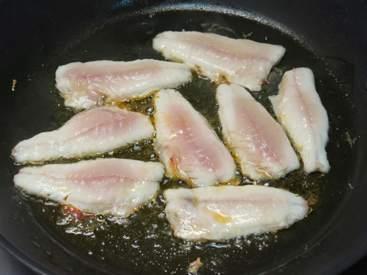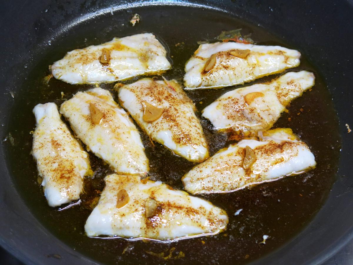 Añadimos un poco de la salsa que hemos hecho con el ajo y el pimentón, todavía muy caliente, de esta forma cocinamos la parte de arriba de los lomos del salmonete.