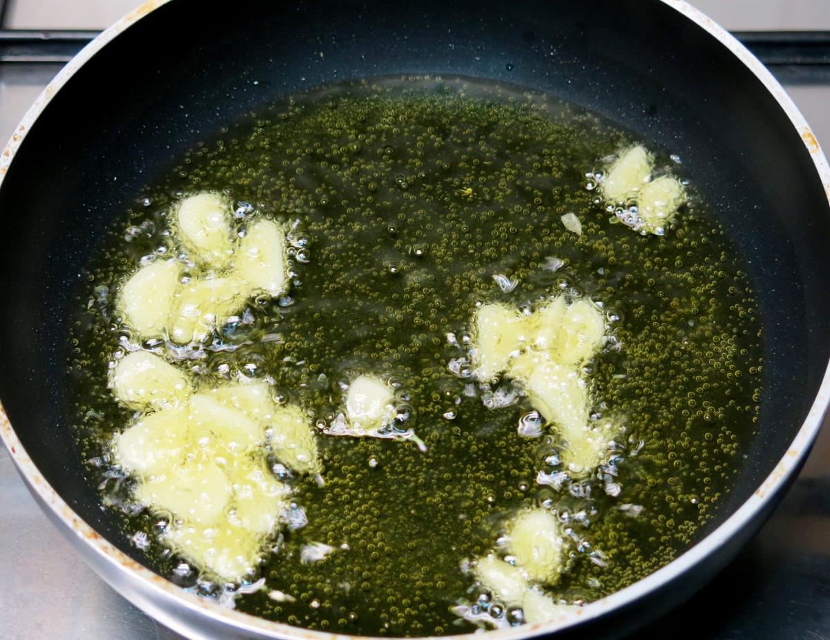 En una pequeña sartén ponemos unos ajos laminados a freír, con mucho cuidado que no se quemen.