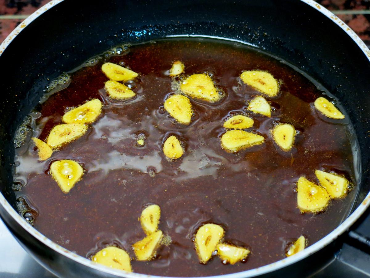 Una vez estén los ajos en su punto, retiramos del fuego y añadimos una cucharadita de pimentón de la Vera, movemos enérgicamente y ya tenemos nuestra salsa para la espalda, hay quien le pone unas gotas de vinagre a esta salsa, yo esta vez no le he puesto, reservamos.