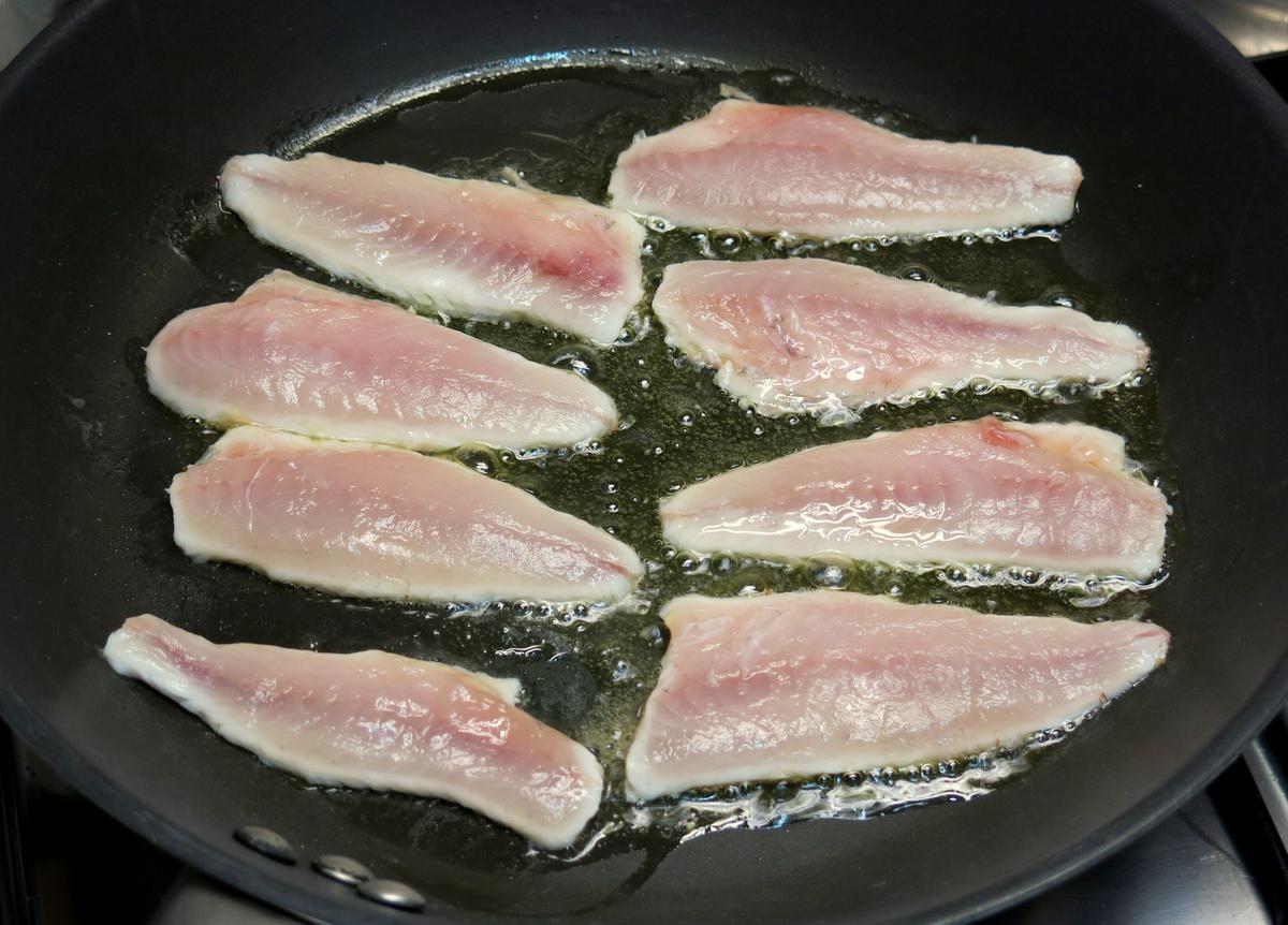 En una sartén con un poquito de aceite marcamos los lomos de salmonete, por la parte de la piel, no le damos la vuelta.