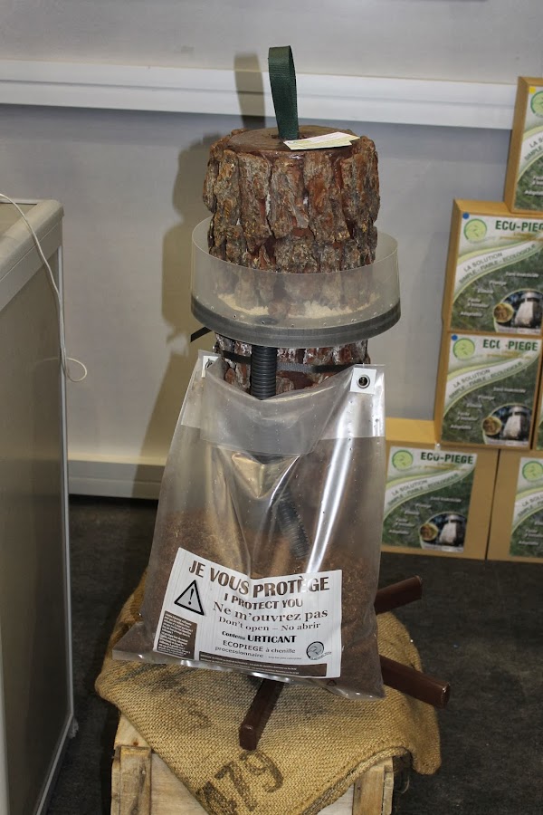 Este de aquí es para capturar la procesionaria. Funciona de la siguiente manera, las orugas cuando bajan al suelo ha poner sus pupas, quedan atrapadas en la bolsa donde hay tierra y allí hacen la pupa, esto es de una empresa francesa, nos contaron que allí esta prohibido utilizar cualquier tipo de insecticida.