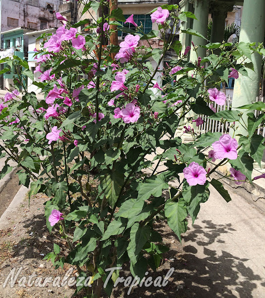 Fotografías y características de la planta arbustiva conocida como Campanita Morada, Ipomoea carnea. Consejos básicos para su cultivo en el jardín.
