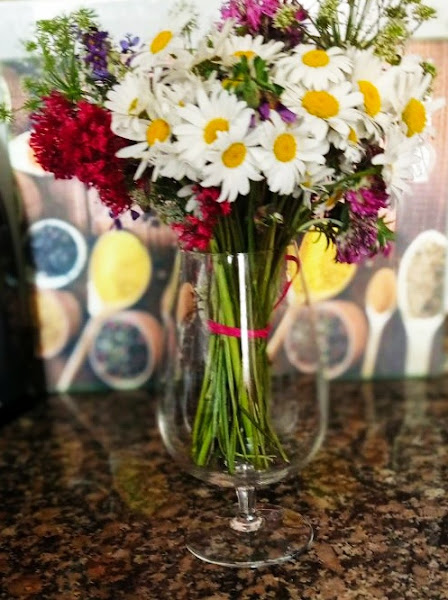El ramo que os acabo de enseñar lo coloqué en una copa muy grande que tengo y lo dejé en la cocina. Lleva margaritas, daucus carota, centaurea, fumaria...No le puse nada especial porque ya es muy alegre y no quería recargarlo.