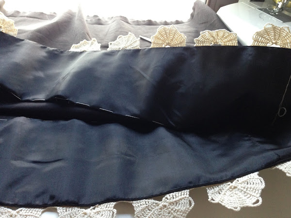 La falda he cosido de la gabardina - una tela fuerte. Pero el encaje pesa bastante. Y para que el dobladillo de la falda no pierde la forma, he reforzado por la cinta ancha de caprón.