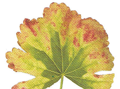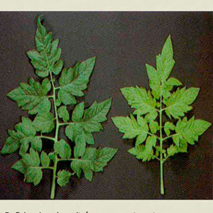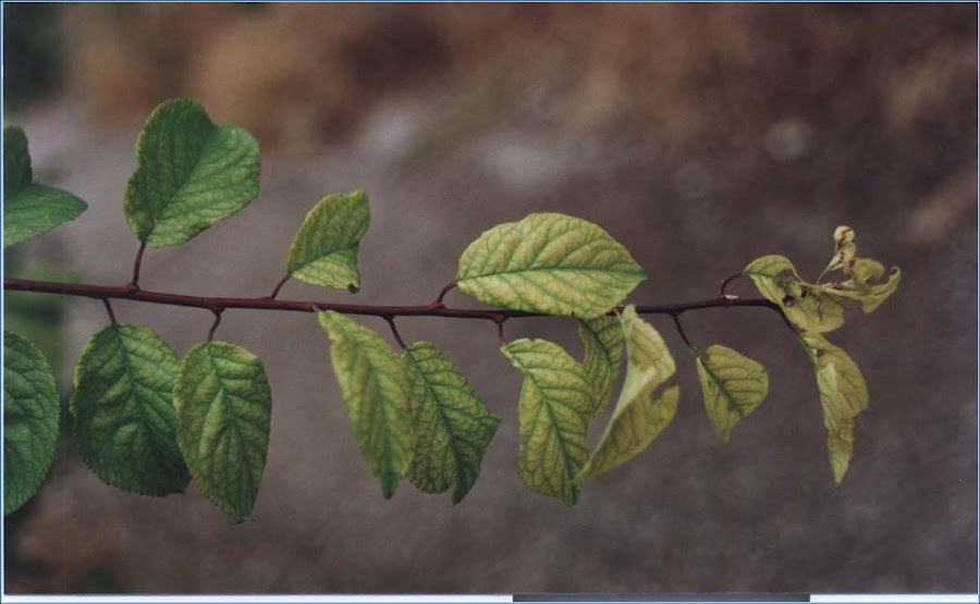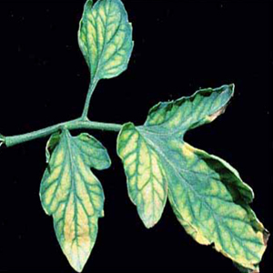 También aparece color amarillento tanto entre los nervios como en los bordes, siendo las hojas de abajo y mas viejas las más afectadas. Más tarde, afecta a las hojas jóvenes, hasta la caída de hojas. La expresión de todos estos síntomas depende en gran medida de la intensidad a la que las hojas están expuestas a