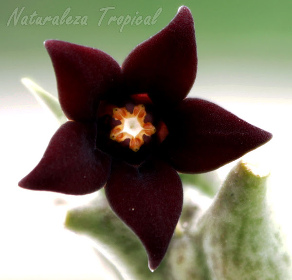 Vista delantera de la flor típica de la Estrella Negra (Orbea decaisneana). Pachycymbium decaisneanum o Caralluma hesperidum
