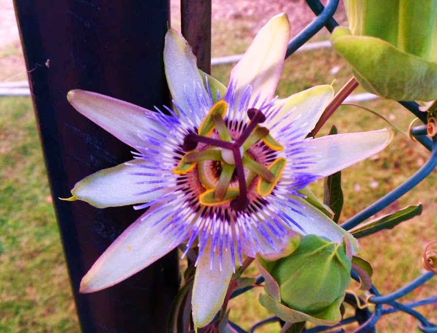 Esta flor tan bella, perfecta y rara es la flor del maracuyá o fruta de la pasión, también conocida como pasionaria.