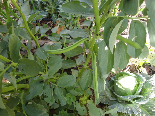 Decidimos que estas matas de habas, que habían brotado espontáneamente, compartiesen bancal y se desarrollasen entre lechugas,brócolis, cebollas, acelgas.... y ... no les ha ido nada mal.