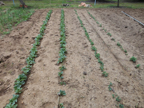 Entre los plantones de coles y coliflores brotaron algunas matas de habas. (No nos extrañó en absoluto ya que las habas estuvieron aquí plantadas la temporada anterior).
