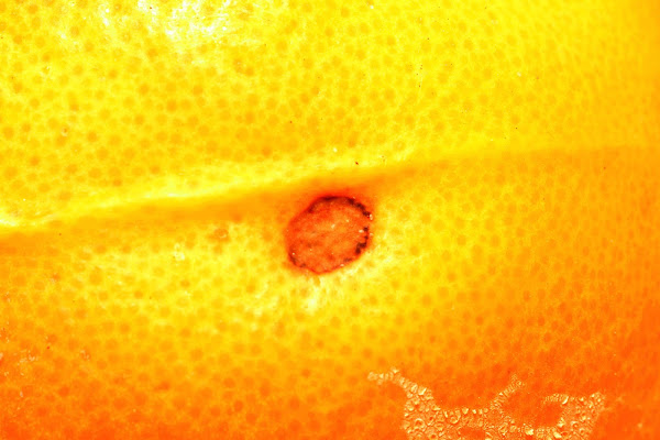 Naranja dañada por la mosca de la fruta (Ceratitis capitata).