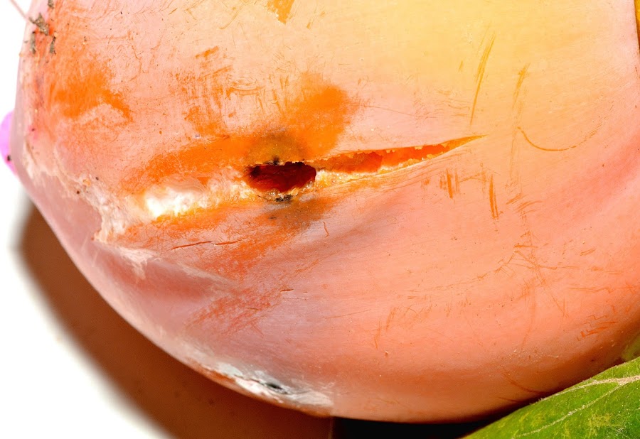 Se trata de los daños producidos por la mosca de la fruta (ceratitis capitata), que pone sus huevos en la fruta todavía inmadura de la que darán buena cuenta sus voraces larvas.