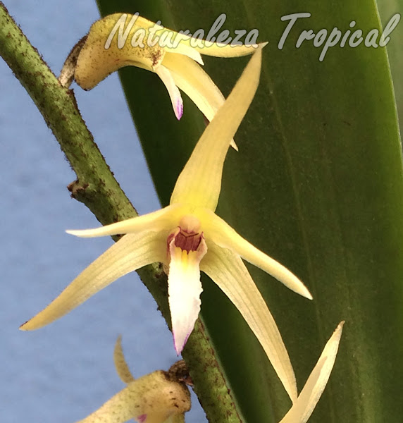 Las flores se disponen en inflorescencias racimosas de aproximadamente 30 cm de largo (en ocasiones más de 55 cm) que se originan de los lateralesde los pseudobulbos. El tallo floral de las inflorescencias presenta numerosos y diminutos pelos de color marrón. Además este tallo floral puede mantenerse erecto durante toda la floración o ser decumbente. Las flores son pequeñas, tienen forma estrellada; presentan los pétalos y sépalos de similares tallas, forma (linear) y coloración (amarillo pálido con visibles líneas) aunque los sépalos un poco más anchos en la base y el labelo linear con la región basal amarilla y el resto de color blanco. En el centro de las flores se observa una coloración morada muy conspicua. Las flores en esta especie presentan una aroma muy dulce que se mantiene durante todo el día. La época de floración de esta orquídea comienza a finales de la primavera hasta inicios del invierno.