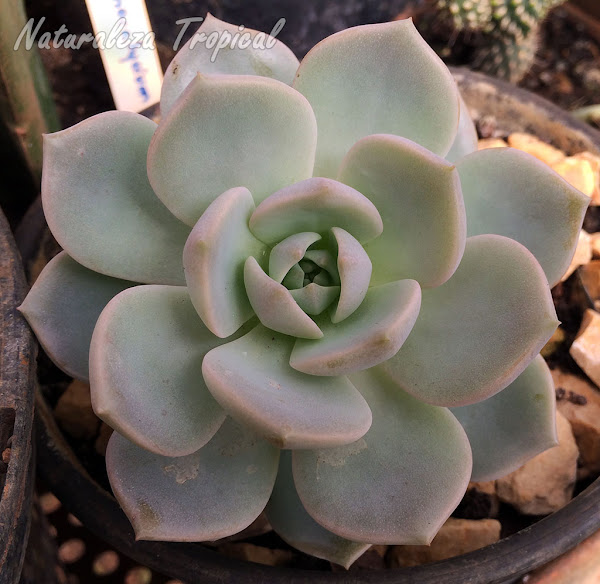 Las hojas se disponen en rosetas bastante compactas debido a que son muy carnosas. Por lo general las rosetas no son muy grandes (+/- 6cm de diámetro) aunque en algunos ejemplares hemos observado algunas con más de 10 cm de diámetro. Las hojas son redondeadas con el ápice formando una evaginación puntiaguda, tienen el margen entero y presentan una coloración verde grisácea muy atractiva.