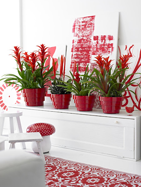 1* Guzmania: También conocida como bromelia, esta preciosa planta, de tallaje verde hasta que aparece su flor rojiza. Normalmente suelen morir después de florecer. Necesita un riego constante ya que es una planta tropical y necesita humedad, y no ponerla a plena exposición del sol.