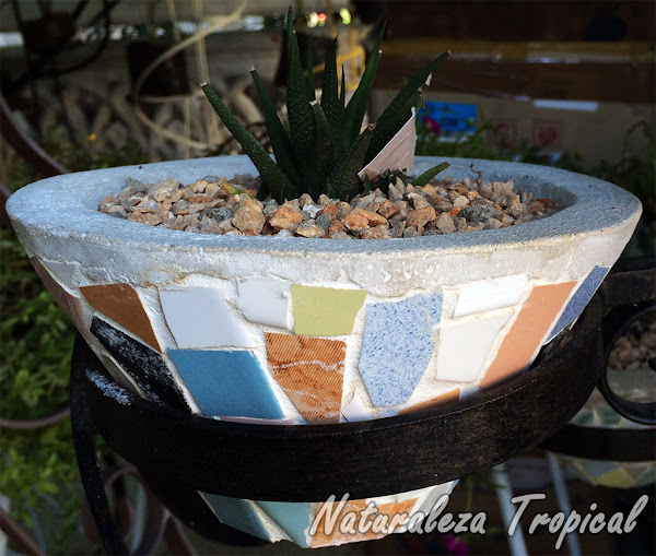 Maceta de hormigón decorada con fragmentos de losas de colores