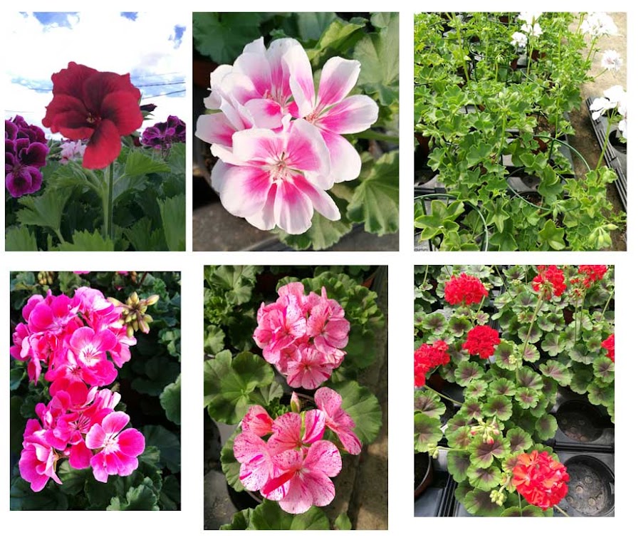 1.Geranio zonal. Son hibridaciones de distintas especies, con flores de muy variados colores, blanco, violeta, rosa, rojo flores simples, dobles. No aguantan el frío ni el encharcamiento, pero si aguantan bien la sequía. Son geranios grandes, pueden llegar a ser arbustos, si no se podan, y con las condiciones adecuadas.