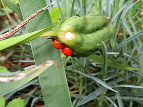 Florece desde mediados de primavera hasta principios de verano y si sus flores no resultan excesivamente aparentes comparadas con las de otros lirios, su fruto sin embargo es todo un espectáculo. Una vez madura, se abre la cápsula, alargada y angulosa, y asoman las semillas: unas bolitas de color naranja vivo que persisten durante mucho tiempo (se forman a finales de verano y resisten hasta la primavera).