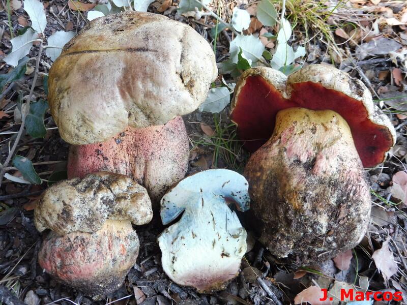 Rubroboletus satanas. Crédito: Javier Marcos Otras confusiones que revisten menor gravedad son los babosos, especies de comestibilidad mediocre que se incluyen en el género Suillus, caracterizados por su cutícula generalmente viscosa (excepto Suillus variegatus que es seca), los poros amarillos, el pie generalmente granuloso (anillado en algunas especies) que fructifican asociados a pináceas (alerces y pinos). Otra posible equivocación es con los faisanes, comestibles mediocres del género Leccinum y Leccinellum, que presentan mucho menor porte, los poros blanquecinos que oscurecen a la manipulación, la carne blanca inmutable o que oscurece al corte que fructifican en planifolios (abedules, álamos, alcornoques, avellanos, castaños, encinas, hayas y robles). También se pueden confundir con el boleto bayo (Imleria badia), buen comestible, que tiene la cutícula pardo rojiza, los poros amarillentos que azulean levemente a la manipulación, la carne blanquecina que azulea ligeramente al corte, que fructifica generalmente bajo pináceas en suelos ácidos y con el boleto dulzón (Hemileccinum impolitum), comestible que presenta la cutícula pardo amarillenta, los poros amarillos, el pie amarillento bastante granuloso y la carne blanquecina o amarillenta inmutable, con olor desagradable a yodo en la base del pie que fructifica en bosques mediterráneos de encinas en suelos ácidos.