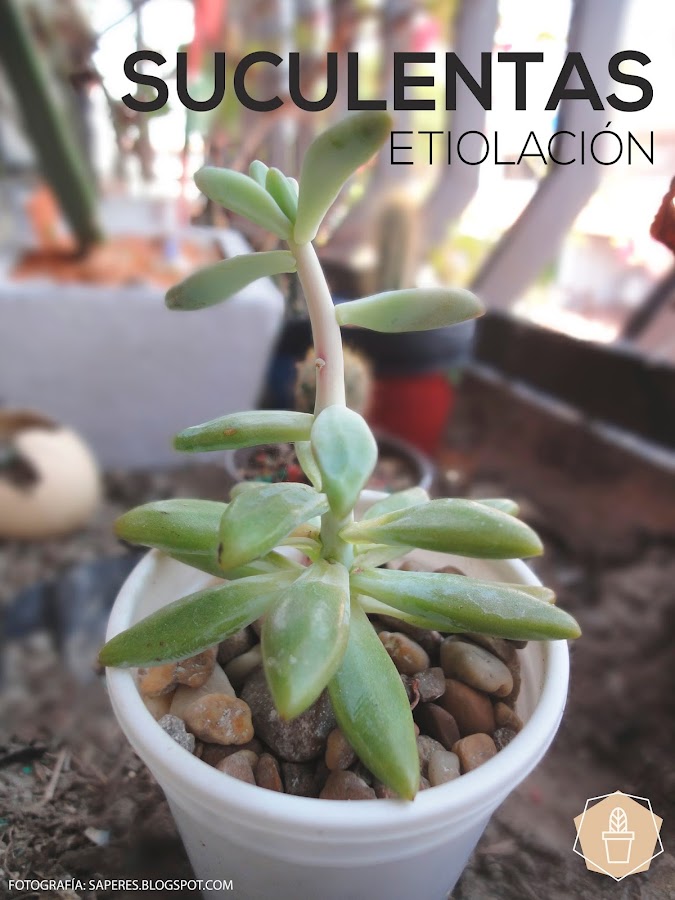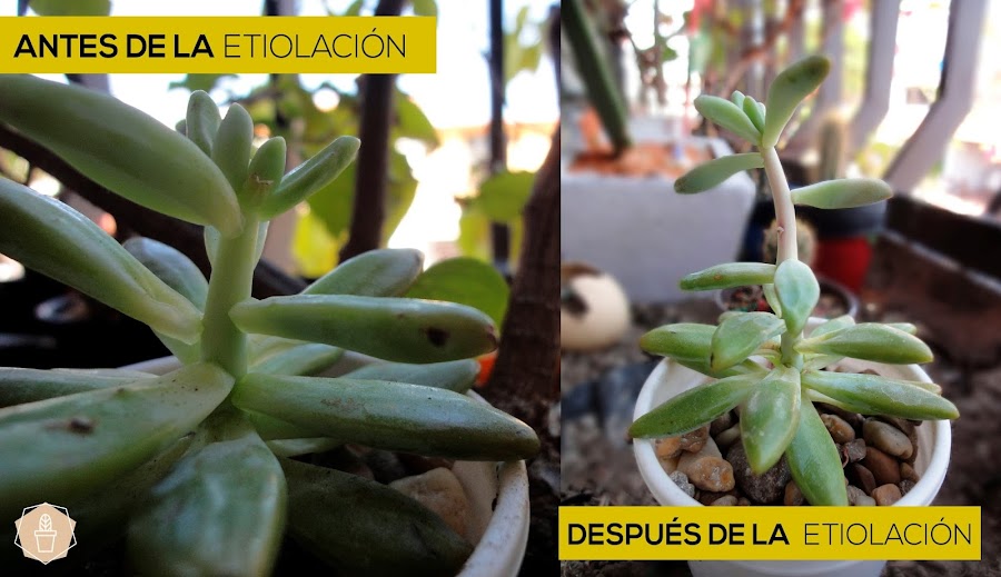Pero, si en cambio tú suculenta se encuentra en el interior del hogar u oficina, con muy poca luz y notas que se está estiraaaaaannndo y perdiendo un poco su forma original… no temas, este proceso se llama etiolación. La etiolación es un proceso de alargamiento de la planta frente a la falta de luz solar, esto no siempre resulta en la muerte, pero puede debilitar la planta y hacer que se vea menos atractiva. Para corregir esto, debes de poner la planta al sol, por lo menos una vez al día, pero recuerda, no una luz intensa y directa, puede quemarse.