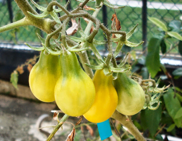 Los tomates pera amarillos ya están cambiando de color y se están usando en la cocina y ensaladas. :) La planta saco como 6 docenas de tomates y ya no están saliendo flores; osea que esta en la ultima etapa antes de secarse. Tengo dos plantas mas de tomates pera amarillos pero están pequeñas todavía. Las de mini cherry tomatoes ya mismo las trasplanto.