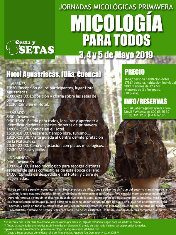 Desde el Viernes por la tarde, y junto a la exposición micológicas que nos estará esperando en el Hotel Aguasriscas de Uña, donde empezaremos con una pequeña introducción a las setas más interesantes que podemos encontrar en primavera, hasta el Domingo que terminaremos en el Restaurante del Hotel, con una excelente comida, disfrutaremos de un fin de semana con todo incluido, donde naturaleza, gastronomía y cultura serán las principales protagonistas, junto con la micología que por supuesto, nos acompañara durante nuestros paseos matutinos.
