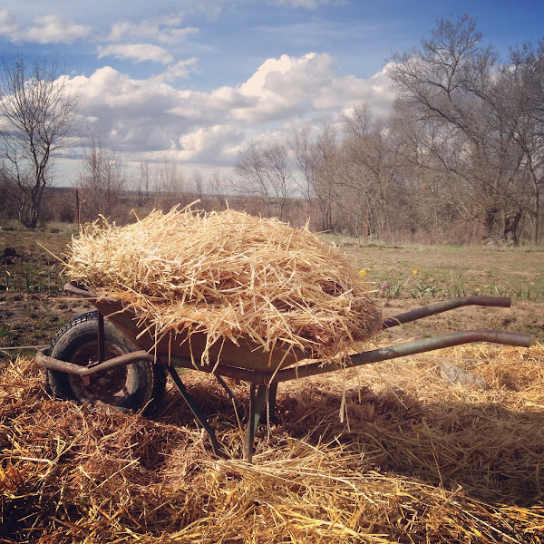 Hasta domingo en algunos 500m mas arriba estaba nevando y aqui hacia muy frio, el aire helado no tenia nada comun con la primavera. Hoy hace buenisimo! La temperatura por la tarde esta muy agradable entre 15-18 grados, casi sin viento (que esta muy raro para nuestro campo).. Ultimos 2 o 3 dias huele de primavera! Y yo tengo tarea para una semana como minimo - cubrir todo el huerto para guardar humedad. Creo que con el sol y el viento se secara todo muy rapido.