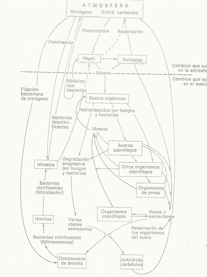 Los cuadros siguientes nos muestran las interrelaciones que se conocen entre los organismos del suelo, las cuales son necesarias para mantener el equilibrio y completar de manera eficiente el ciclo del nitrógeno y carbono; en fin, como para meter mano en alguna de ellas...