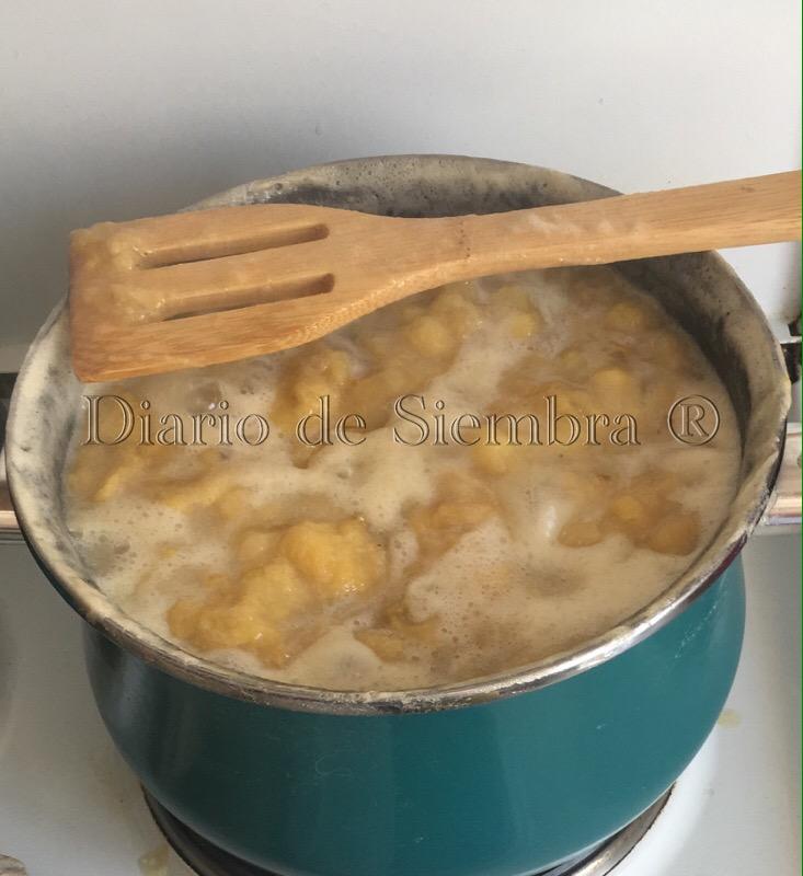 Entonces cambie la olla y puse al fuego la olla que había colocado los plátanos. Vertí el resultante de la otra olla, y calenté a fuego medio sin dejar de remover.