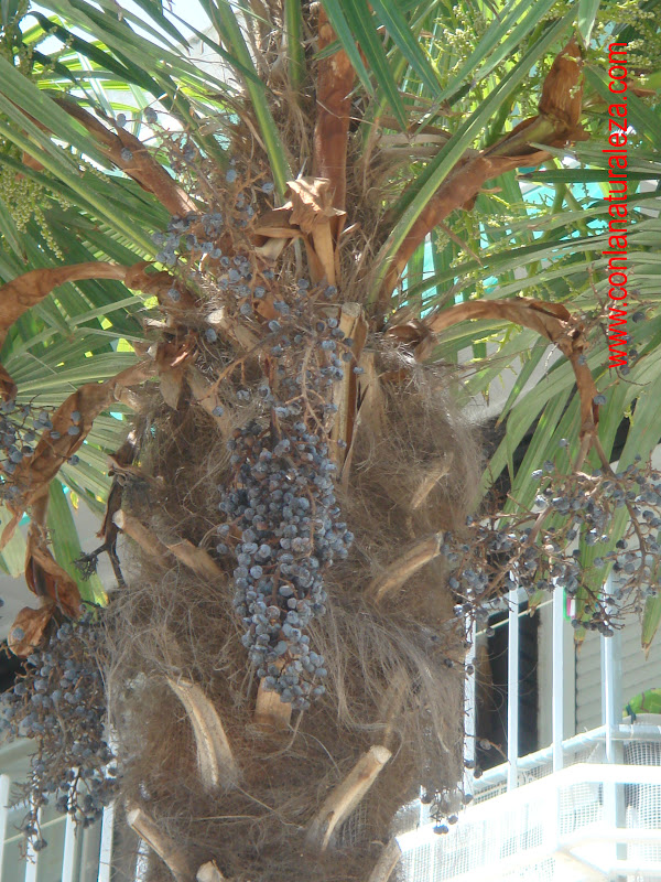 Tronco cubierto del resto de la base de las hojas viejas y de una fibra oscura. Tronco más grueso en la parte superior