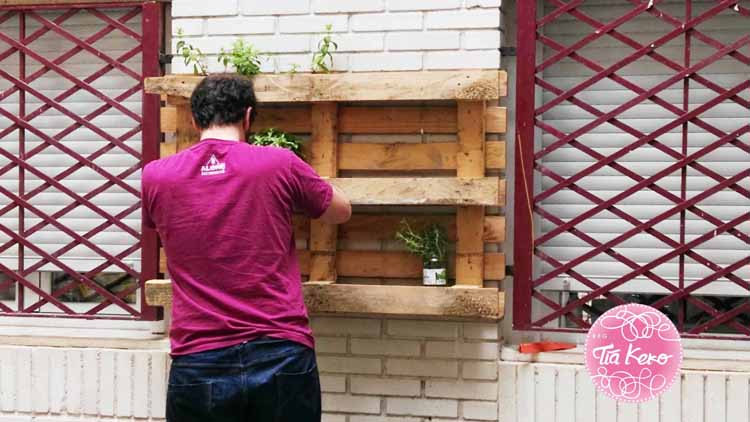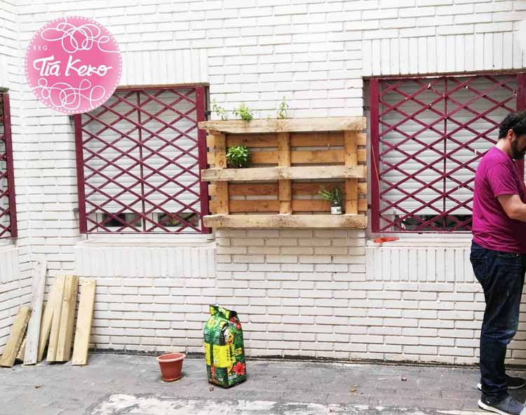 Con un viejo palet que encontró en al calle y partes de otro roto que tenia por casa se construyo un jardín vertical perfecto para ponerlo en nuestro patio.
