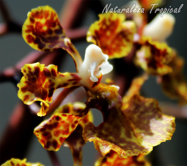 Vista lateral de la flor dela orquídea Oreja de Burro, Trichocentrum undulatum