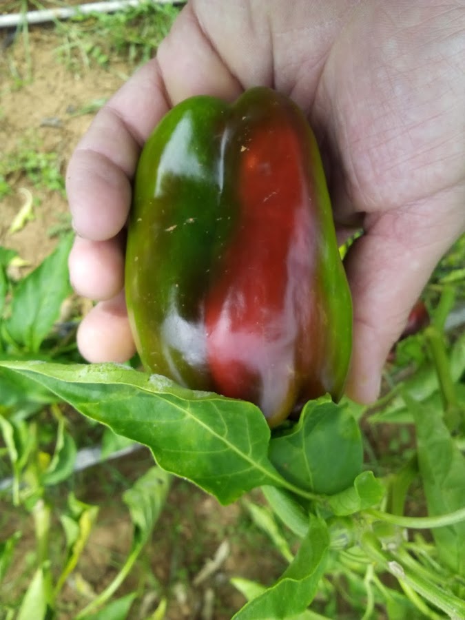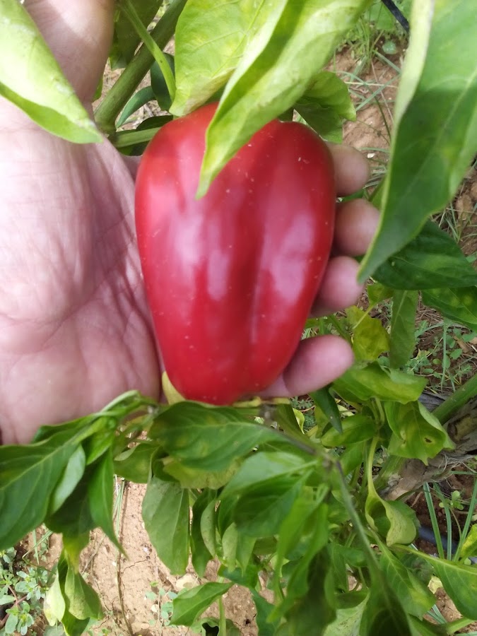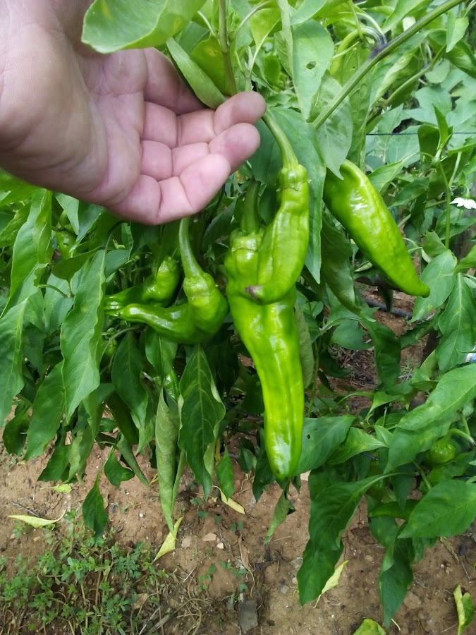 Las plantas de pimientos todavía sacan flores nuevas y produce buena cantidad de pimientos, de la variedad italianos y morrones, en este caso.