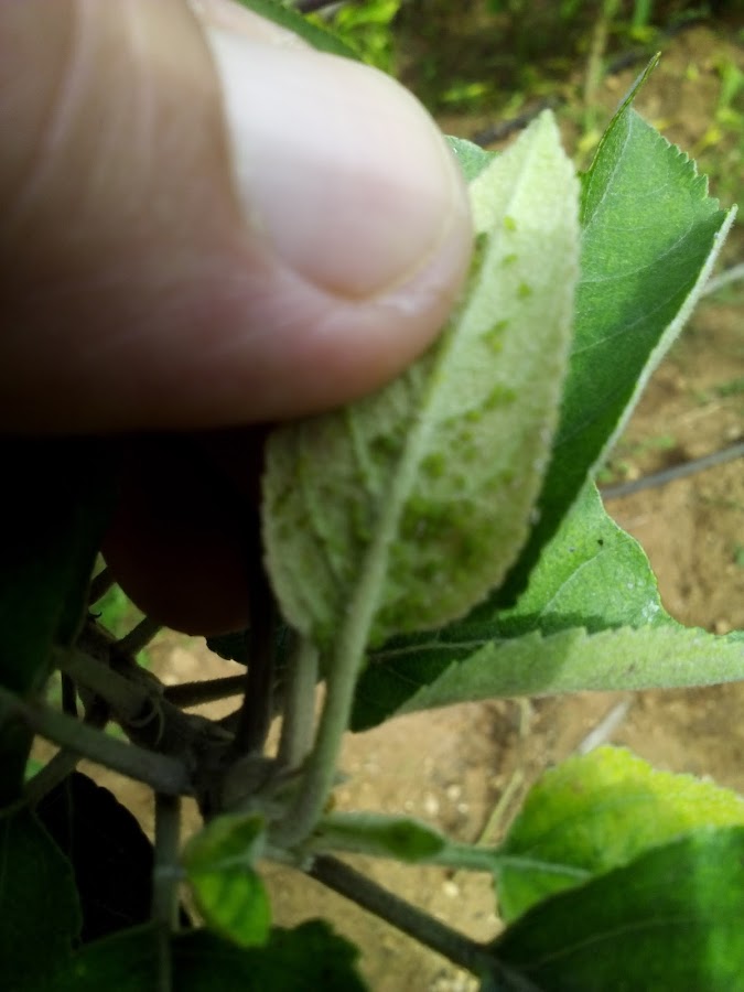 Las hojas nuevas de manzano han vuelto a albergar pulgón. Estos bichos son muy pesados, en cuanto las condiciones son favorables aparecen para darse un festín.