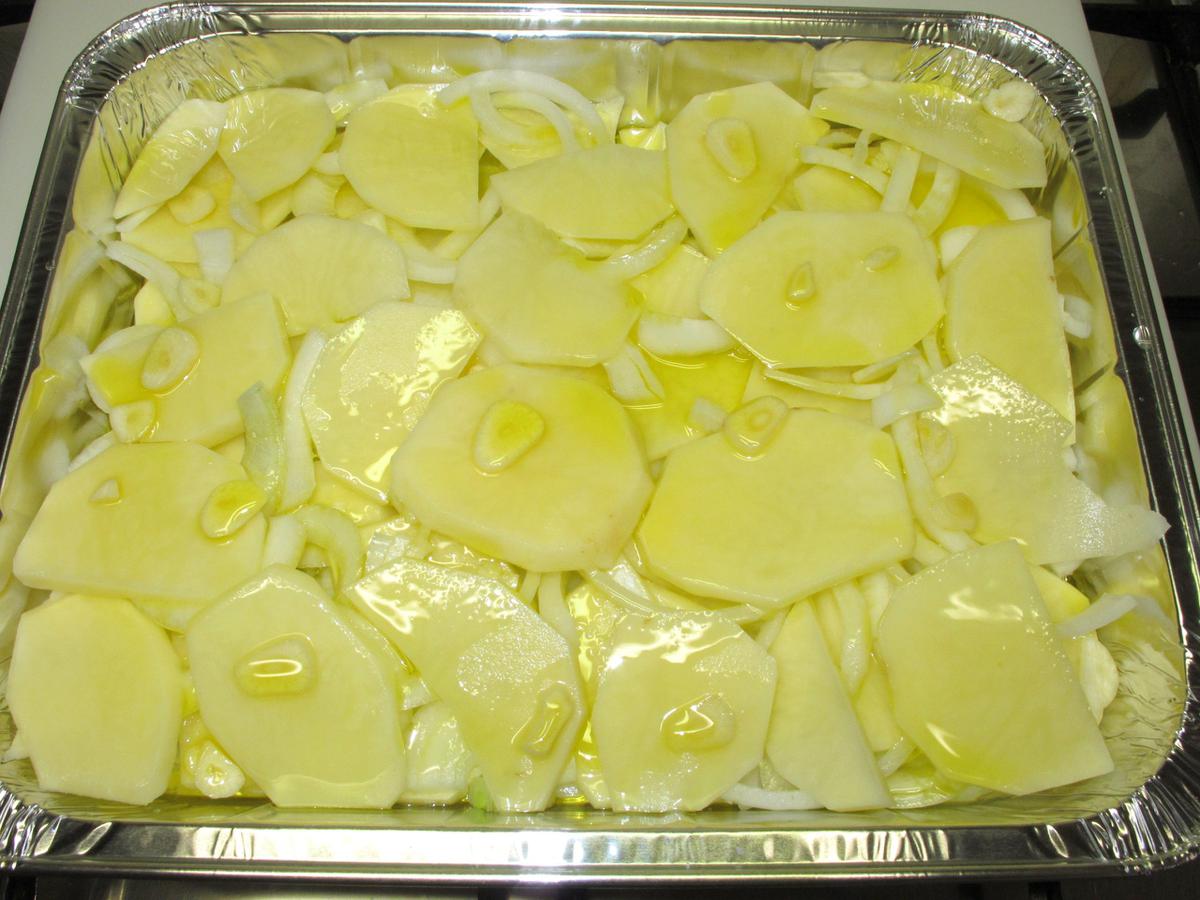 Pondremos en una fuente para el horno, las patatas nuevas, y la cebolla tierna, unos ajos laminados, sal y un buen aceite de oliva virgen extra, añadiremos un chorrito de agua, esto ayudará a que no se nos quemen las patatas panadera.Meteremos al horno a 180º el tiempo necesario, a mitad de cocción, les daremos la vuelta con mucho cuidado de no romperlas.