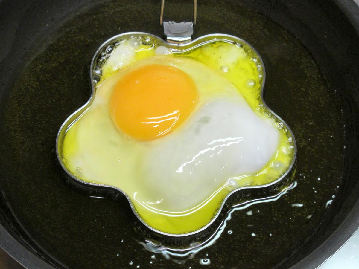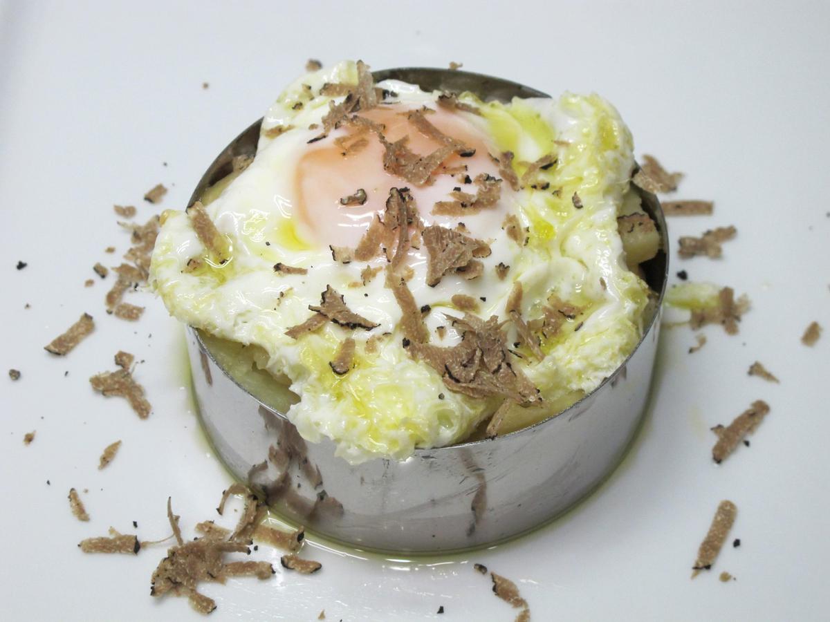 Freiremos el huevo de corral en un buen aceite de oliva virgen extra, como podéis ver, le he dado una forma de flor al huevo, lo colocaremos encima de las patatas, pondremos unas escamas de sal maldon y rallaremos un poco de Tuber aestivum.