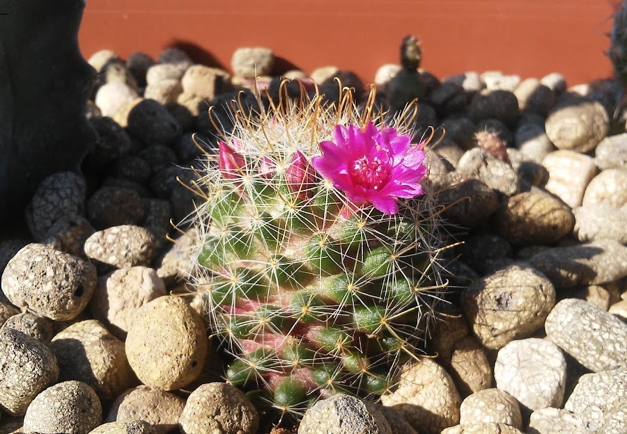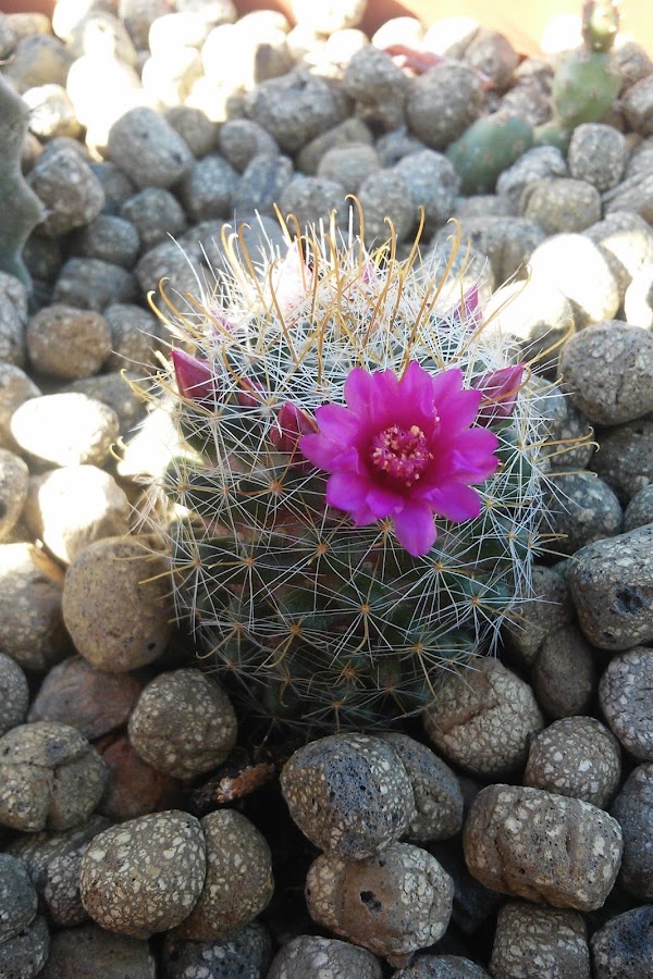 Hoy os quería mostrar la flor de una pequeña mammillaria que recibí de un intercambio procedente de Madrid. No sé su nombre pero su flor es hermosa. En cuanto tenga la corona llena de flores, subiré fotos.